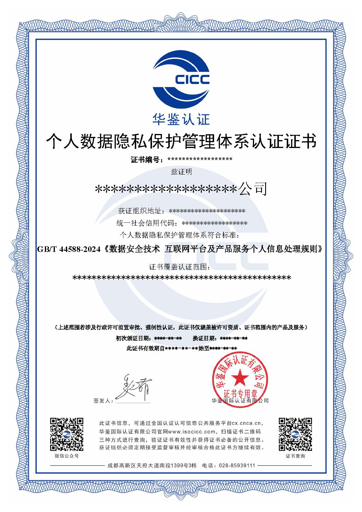 个人数据隐私保护管理体系认证为国际标准化组织(ISO)发布的全球普遍认可、具有国际性的隐私信息管理体系认证标准,个人数据隐私保护管理体系认证为针对云计算环境下信息安全控制实施指南类的国际标准。